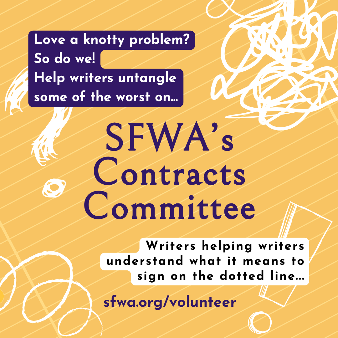 Contracts Committee: The Contracts Committee is looking for volunteers for 1–2 hours per week. Experience with a variety of publishing contracts is a must. Formal legal training is helpful. Duties will include participating in committee subforum discussion and helping to write model contracts, contract alerts, and blog posts.