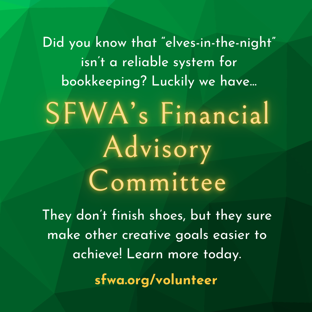 Financial Advisory Committee: Duties include reviewing monthly and annual financial statements, budgets, and asking questions when appropriate. Sometimes the committee also weighs in on policies for good fiscal management, sending their majority opinion to the Board. The time commitment for this volunteer position is low: typically an hour or two per month to review and reply to email about various financial documents. Committee members should have background education or experience in Not For Profits (like SFWA) in the following areas: accounting, tax, or legal. Individuals with a strong background in finance should send details to be considered.