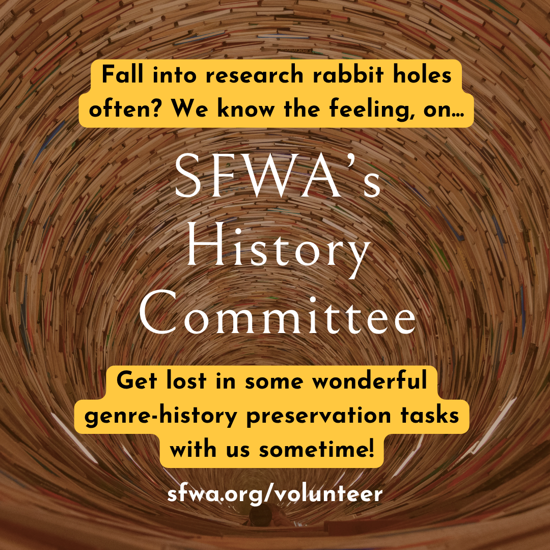 History Committee: The History Committee works to help SFWA locate, collect, and preserve SFWA’s history, through interviews and archiving of documents, as well as providing historical information to staff and board members to ensure institutional memory and facilitate smoother leadership transitions. We’re working to find more physical and digital homes for SFWA’s history, and currently looking for two volunteers to serve on the committee.