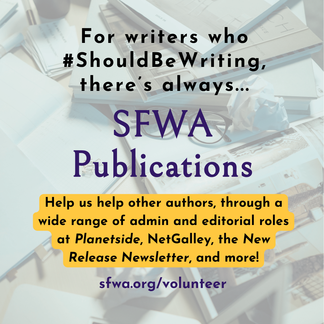 Publications: If you have experience with line or copy editing, consider joining SFWA Publications! The Pubs Crew primarily selects pitches and works with authors on line edits for The SFWA Blog. Typically, this involves line-editing one short piece (800–1000 words) a month, evaluating pitches, advocating for new content, and attending our monthly meeting. Other programs that run through SFWA Publications include New Release Newsletter, NetGalley Partnership Program, In Memoriam, and Monthly Market Report, so we also welcome general volunteers looking to grow their skills in a variety of design and publishing pursuits. Training will be provided!