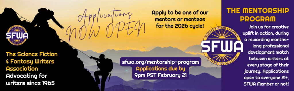 Applications for SFWA’s 2026 Career Mentorship Program is now open! The application cycle launched on February 7, 2026 at 9am PST and will close February 21, 2026 at 9pm PST. To find out about the next Career Mentorship Program period, monitor this page, or sign up for SFWA’s mentorship listserv here.